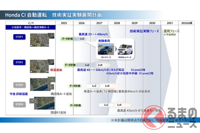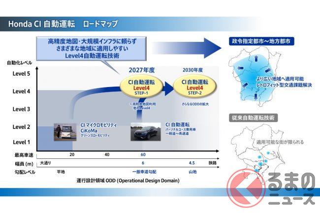 ホンダは、まずは2027年度に最高時速60km・幅員6m以上の道路といった特定条件下でのレベル4認可取得を目指し、小田原の坂道でその精度を磨き上げます。