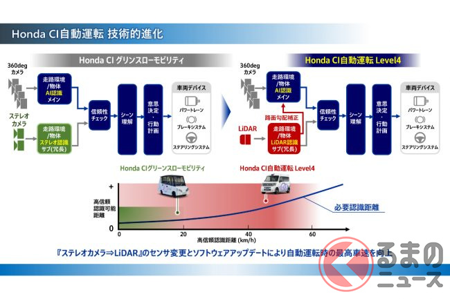 そこでステレオカメラの代わりにLiDARを採用し、AIのソフトウェアアップデートも行うことで、遠方の物体検知能力を高め、時速60km走行時でも十分な安全性を確保できる冗長性を備えました。