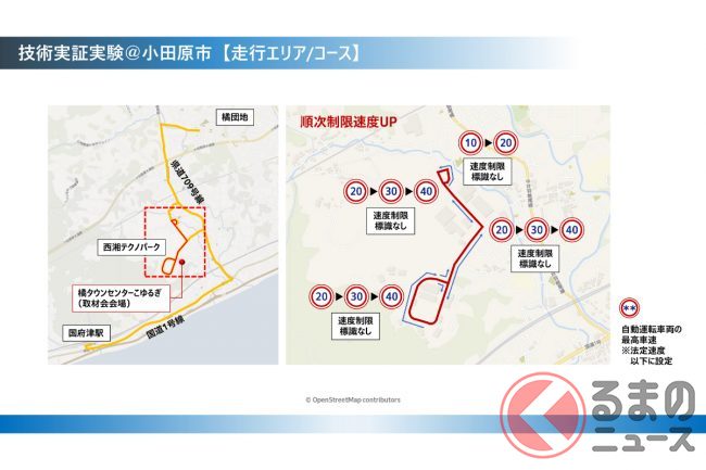 そこでCI自動運転のコンセプトを変更すると共に、今回小田原では時速60kmまでの「中速域」への対応と、特定条件下での自動運転レベル4の認可取得を見据えた実証実験を行っています。