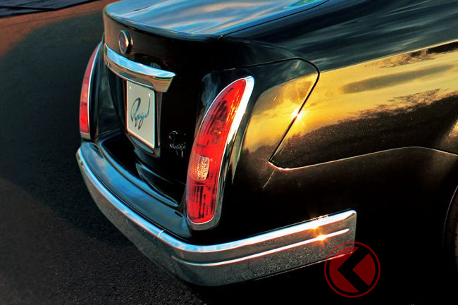 トヨタのベーシックセダン「カローラ アクシオ」をベースに、ハンドメイドで製作した英国の超高級車風のパーツを装備。フロントは縦型の大型グリルと丸形ヘッドライト、メッキバンパー風ガーニッシュで威厳のある雰囲気を演出しています。