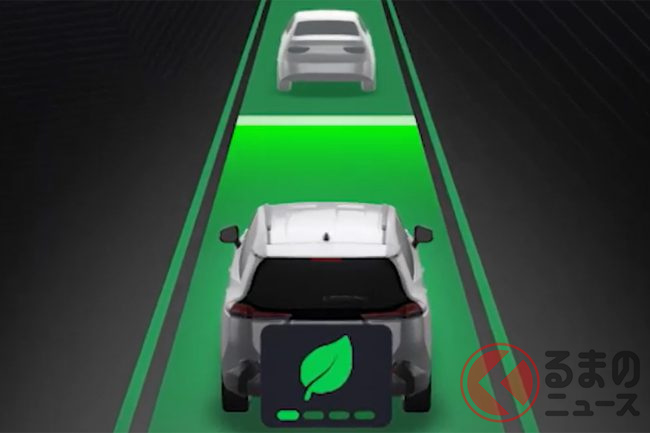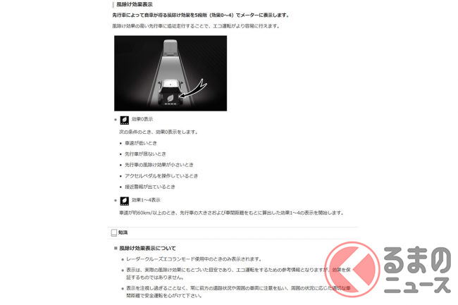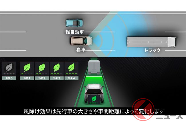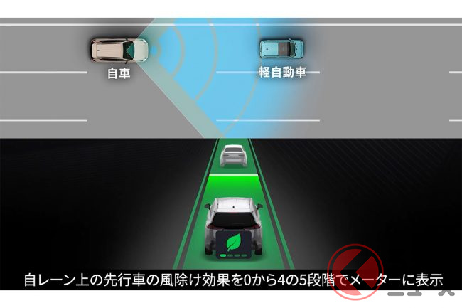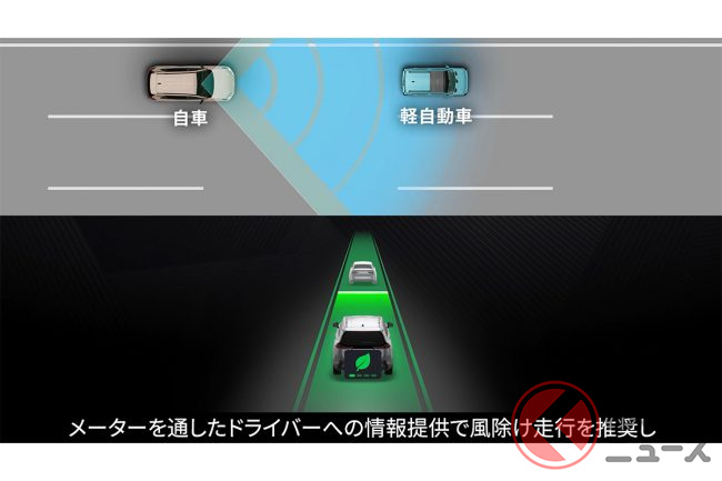 一見するとレーシングゲームのようなこの機能、実際には安全運転と燃費向上を目的とした「風除け効果表示」ですが、どのような意味があるのでしょうか。