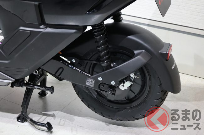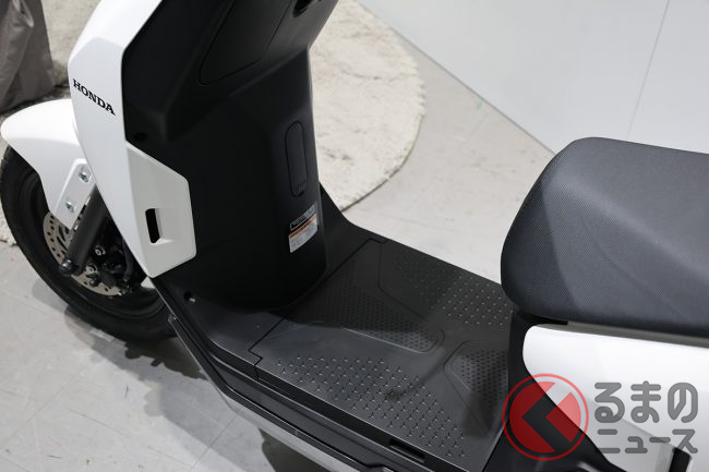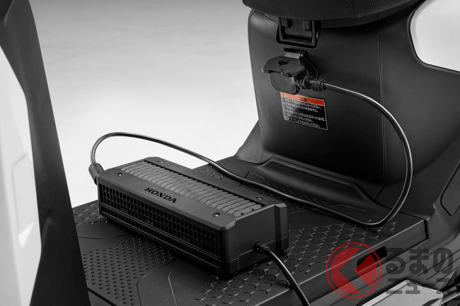 動力源となる着脱式バッテリーは、フロアステップ下に配置されています。満充電からの航続距離は、一充電あたり81km(30km/h定地走行テスト値)です。充電には100Vの外部電源を使用し、バッテリーがゼロの状態から満充電になるまでの所要時間は約8時間、25%から75%までは3.5時間で充電可能。充電方式は車載、またはバッテリーを取り外して行えます。