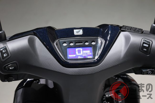 灯火器類はすべてに高輝度なLEDが使用されており、特にヘッドライトは凹凸のないフラッシュサーフェスのシンプルなデザインで、ICON e:の先進性を演出します。メーターには反転液晶表示のフルデジタルメーターが採用され、スピードメーターやバッテリー残量などの情報を分かりやすく表示し、高い視認性を確保しています。