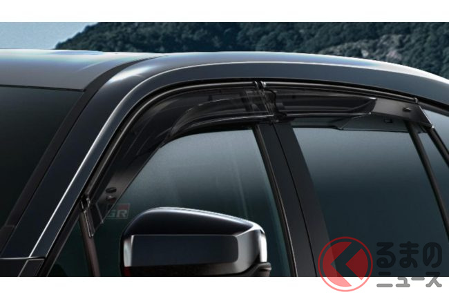 「GRスポーツサイドバイザー(4万1800円)」は、単なる雨よけではなく、バイザー本体に設けられたエアロスタビライジングフィンが空気の流れを整え、ステアリングの応答性や直進安定性の向上に寄与する機能性バイザーです。