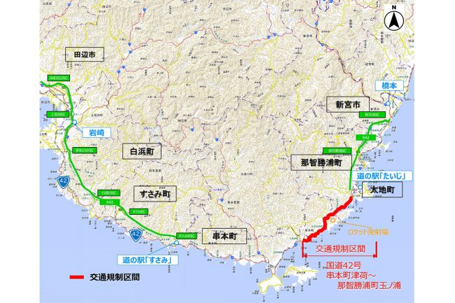 これに伴い、国道42号で見学する人もいることから、スペースポート紀伊の前後5kmの区間が駐停車禁止となります。