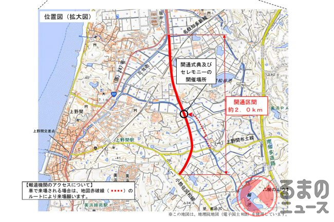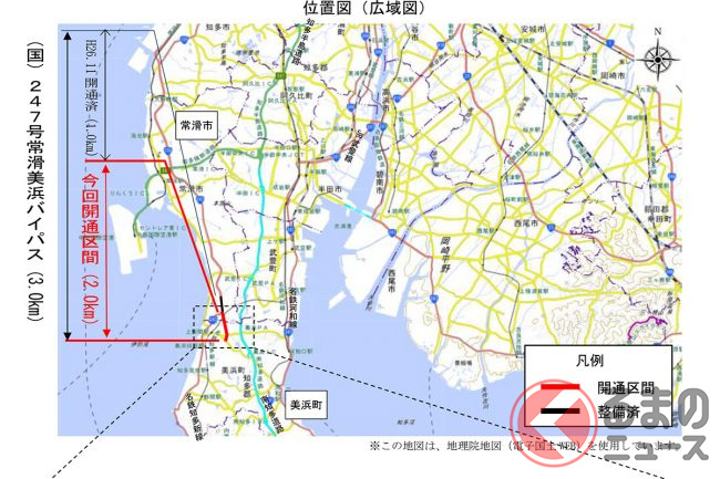 今回開通するのは、常滑市坂井地内から知多郡美浜町上野間地内までの延長約2.0kmです。