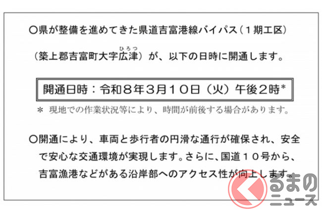 福岡県は、築上郡吉富町大字広津地区において建設を進めていた県道吉富港線バイパスの1期工区について、2026年3月10日の午後2時に供用を開始すると発表しました。
