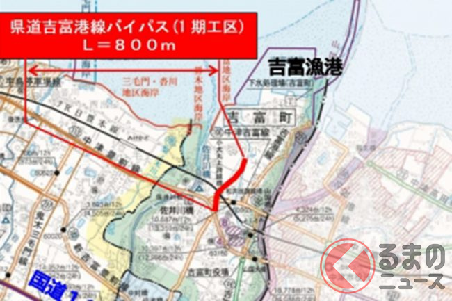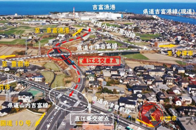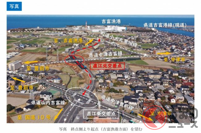 国道10号と吉富漁港などの沿岸部を直線的に結ぶルートが整備され、交通利便性の向上が期待されています。