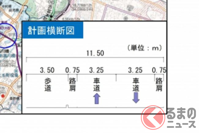 車道幅員は各3.25メートルとゆとりがあり、さらに片側には幅3.5メートルの歩道が整備されます。これにより、車両と歩行者が分離され、双方が安全に通行できる環境が整いました。