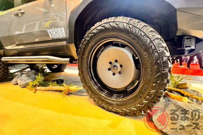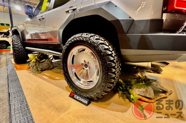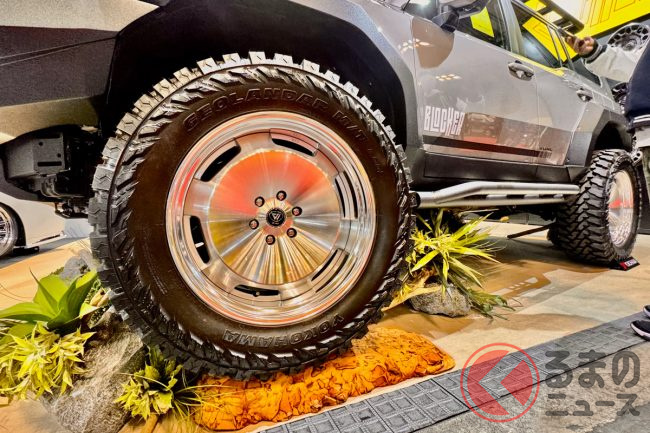 一部のパーツは東京オートサロンで先行発表されていましたが、大阪オートメッセではさらにショートカットバンパーとオーバーフェンダーが追加され、足元には22インチの「VERZ-WHEELS DDR03」2ピースディッシュホイールと37インチタイヤを装着するという、迫力ある姿でした。