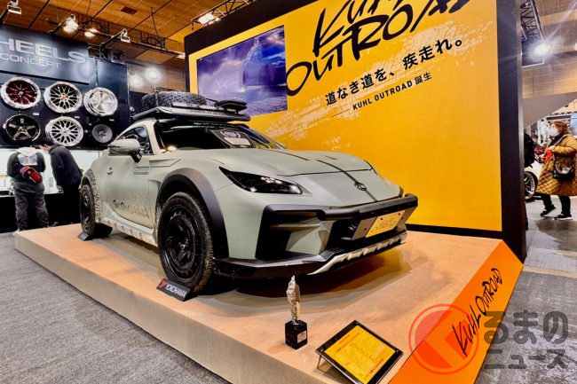 ブースの中央には、東京オートサロン2026でも話題を集めた“アゲ系”スタイルのスポーツカー「OUTROAD(アウトロード)」シリーズのGR86が展示され、斬新かつ悪路もガンガン走れそうなスタイルは、関西でも注目を集めていました。