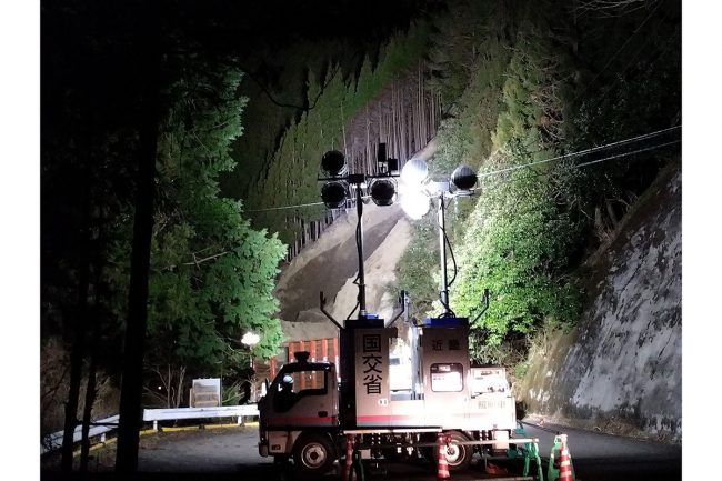 県は早期の復旧に向けて作業を開始しており、近畿地方整備局から照明車を派遣。夜通しで作業を行っています。