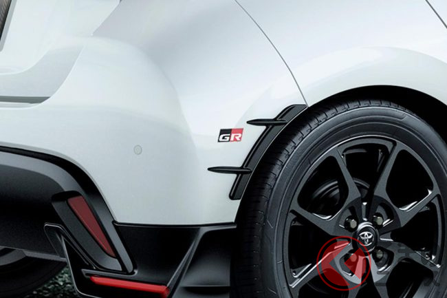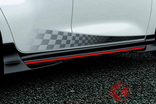 またヘッドライト周りにブラックの意匠を追加し、まるで歌舞伎役者の「にらみ」のような、強烈な目力に昇華するGRフロントバンパーガーニッシュ(2万6400円)や、サイドに赤いラインが入るGRサイドデカール(3万3000円)、高速走行時の直進安定性やハンドリングの向上を図るGRエアロタービュレーター(1万9800円)を装備することで、よりアグレッシブな印象となります。
