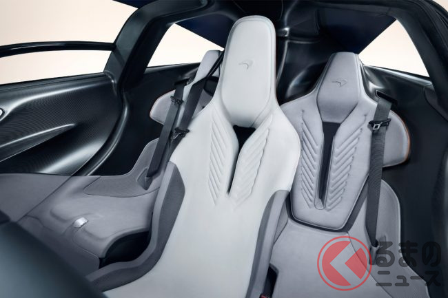 スピードテールの最大の特徴は、なんといっても3人乗りという特異なシートレイアウトにあります。運転席をキャビンのセンターに配置し、その斜め後方左右にパッセンジャーシートを設けるというこの構造は、1992年に誕生し自動車史に燦然と輝く「マクラーレンF1」のレイアウトを現代に蘇らせたものです。