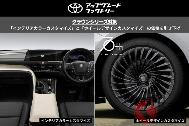 クラウン生誕71年目となる2026年に純正オプションを正規販売店で「後付け」ができるサービス「TOYOTA UPGRADE FACTORY」は、「インテリアカラーカスタマイズ」と「ホイールデザインカスタマイズ」の価格を引き下げました。