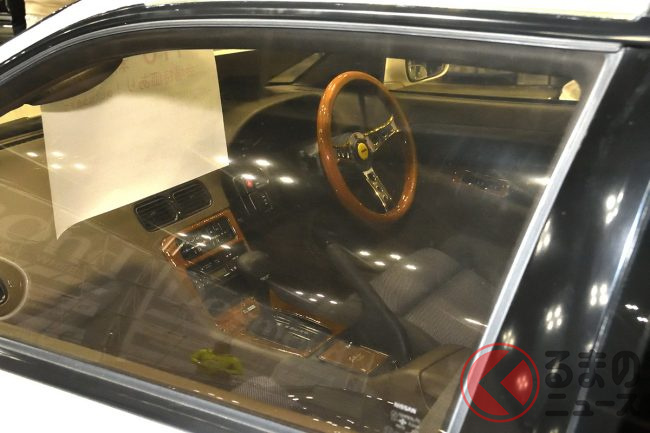 ボンネットの中を見て「CA18DE型エンジン」だと気づいた来場者は、まだ「このクルマは何だろう?」と半信半疑の状態。しかし、車内を覗き込んでS13型シルビアそのままのダッシュボードを目にした瞬間、「あ! これ、中身はシルビアか!」と、ようやくその正体に気づいて驚きの声をあげていました。