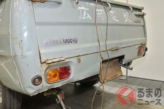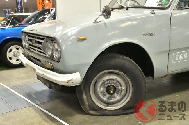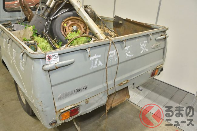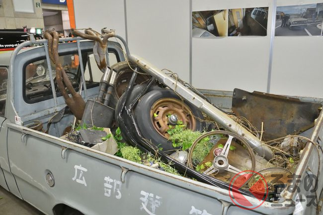 修理する算段をつけたものの、ノスタルジック2デイズ2026には間に合わず、あえて荷台にいろいろと積み、タイヤもパンクした状態で「不動で置いてあった感じ」での展示を行ったといいます。