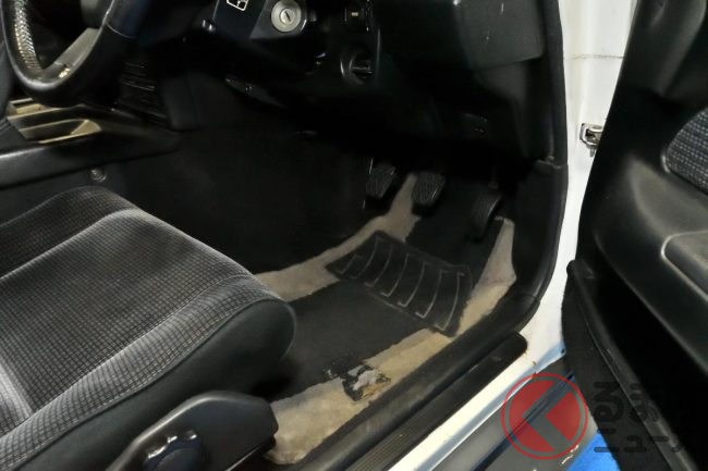 各部の塗装に剥がれやサビが見られるほか、内装にはオーナーの好みで装着されたと思われるアフターパーツの取り付け跡が残るなど、長い年月を感じさせるコンディションでした。