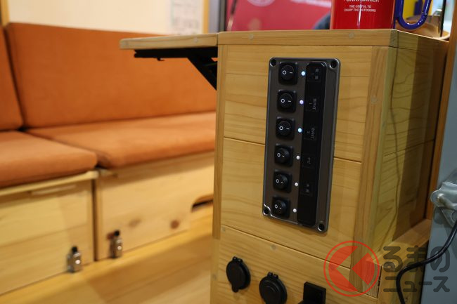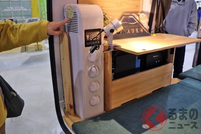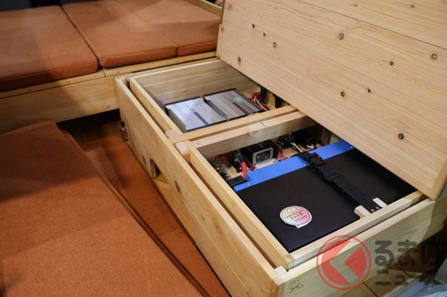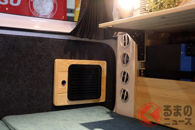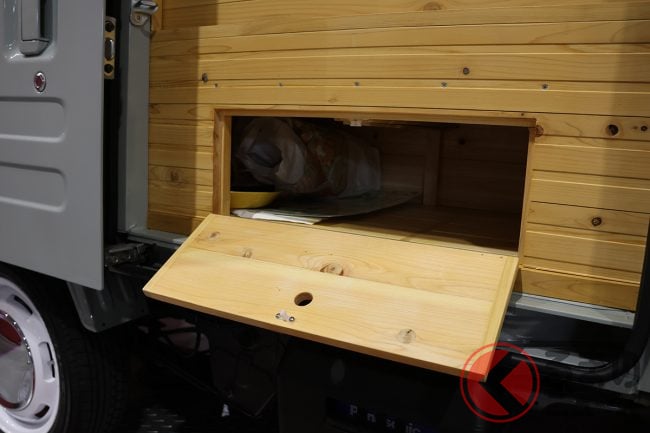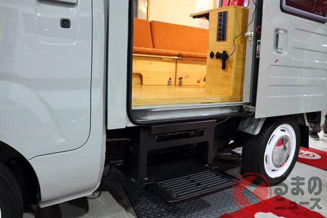 ベース車両は、軽バン「ハイゼットカーゴ」もしくは「アトレー」から選択可能。こちらも縦型の「12V DCコンパクトクーラー(オプション)」や、軽キャンパーでは外すことが多い「スペアタイヤ」を残している点も見逃せません。