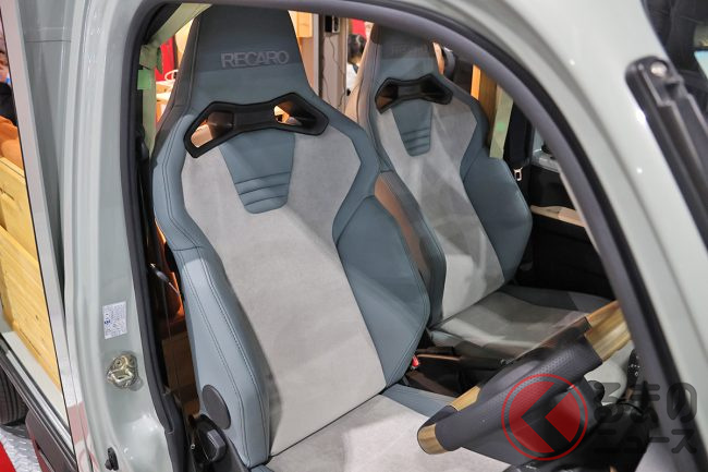 ボディカラーは「ホワイト(標準)」をはじめとした全4色が設定され、展示車は「セラミックグリーン」のボディに、グッドタイミングで登場したという「新色のレカロシート(OP装備)」を組み合わせています。