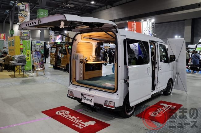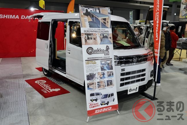 1949年に創業し、1952年からダイハツ車をメインに扱っている「ミシマダイハツ」(静岡県長泉町)では、オリジナル軽キャンパーの「クオッカ」シリーズに新たに加わった2種類のモデルを出展し、来場者の注目を集めています。