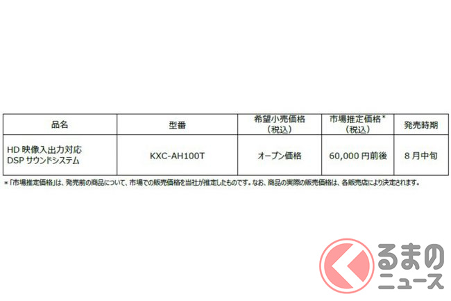 DSPサウンドシステム「KXC-AH100T」の希望小売価格はオープンで、市場想定価格は6万円前後(消費税込み)としています。