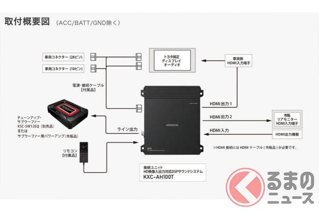 JVCケンウッドは2026年3月3日、トヨタ純正ディスプレイオーディオ(DA)向け高音質、映像拡張キットとして、DSP(デジタル・シグナル・プロセッサ)サウンドシステム「KXC-AH100T」を同年8月中旬より発売すると発表しました。