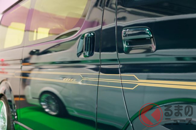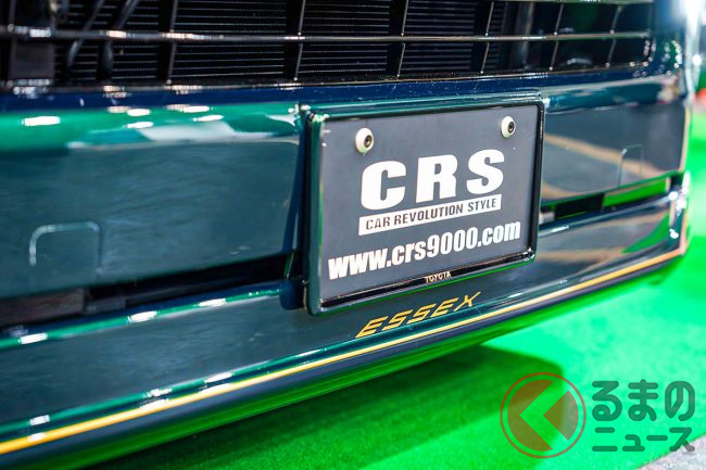ベースとなっているのは標準ボディの2.リッターガソリン車で、エクステリアには同社のESSEXブランドのフロントリップスポイラーVer.4、バッドパネル、オーバーフェンダー、リアウイングVer.1というシンプルな構成ですが、ボディカラーをシックなグリーンでオールペイントし、ゴールドのピンストライプを入れることで“らしさ”を演出。
