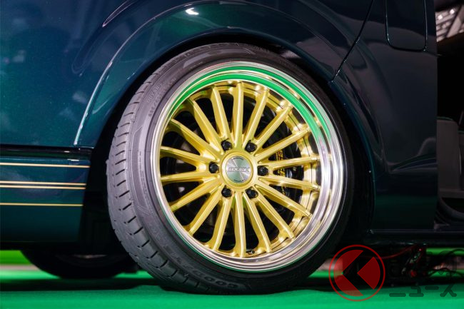 そして足元にはこの車両を制作するきっかけともなったフィンスポークデザインが美しいESSEX EFの19インチホイールを装着し、右側にはシルバーディスク、左側にはゴールドディスクとすることで左右で異なる印象をプラスしていました。