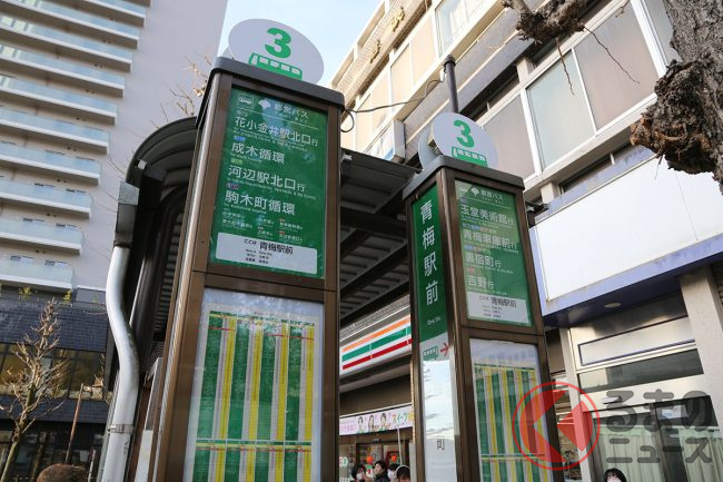 青梅駅に降り立ったのは7時30分頃。駅前のバス乗り場は2つしかなく、都営バスは交番の前にあります。梅76以外にも青梅駅を通る路線は多く、バスを待つ10数人程度の通勤・通学客の姿も見えます。