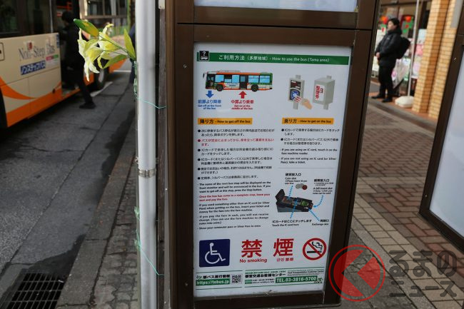多摩エリアの都営バスは、都心部のように前扉から乗って支払い、中扉から降りる均一運賃ではなく、後ろ(中扉)から乗り、降りるときに前で運賃を支払う方式となっているためです。