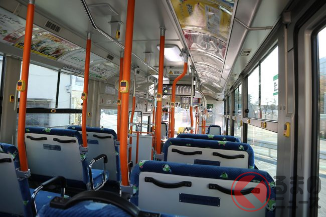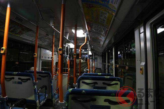 ICカードのタッチを忘れずに、後ろの扉から乗ってみます。さきほどのバス停の人の多さとは裏腹に、梅76には誰も乗りませんでした。