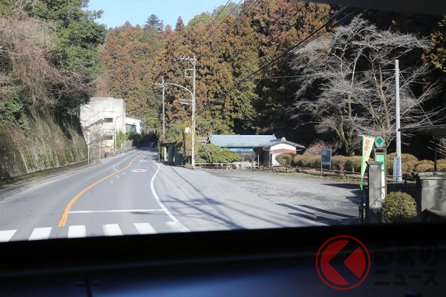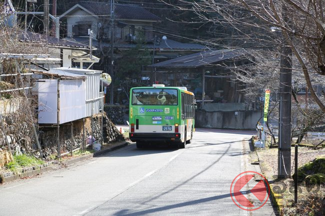 青梅駅出発から約20分。駅前のにぎわいは徐々に薄れ、ぽつりぽつりと建物が少なくなっていきます。「聖明福祉協会前」バス停で数人が降りると、あたりはすっかり山道になってきました。