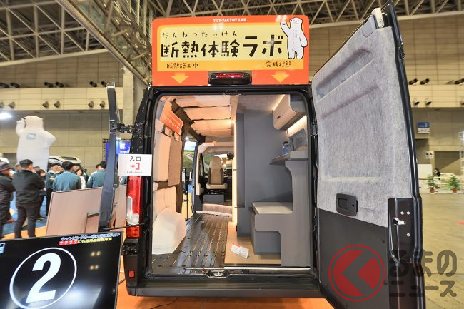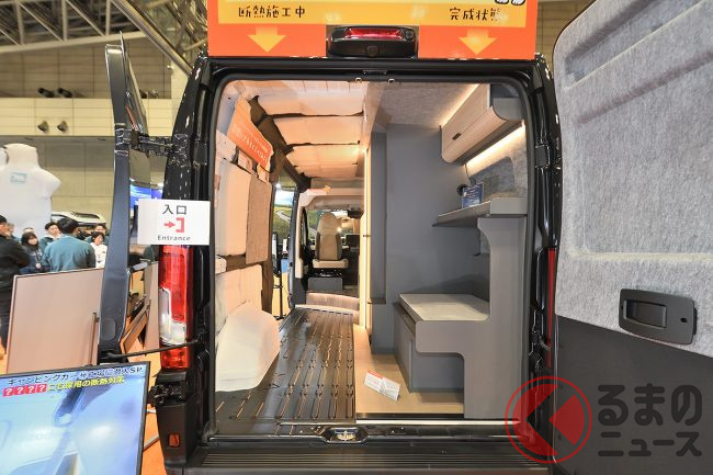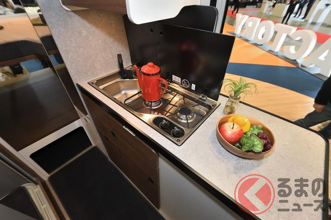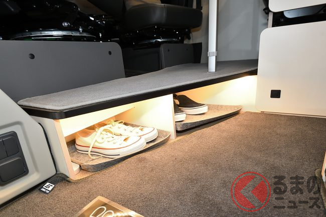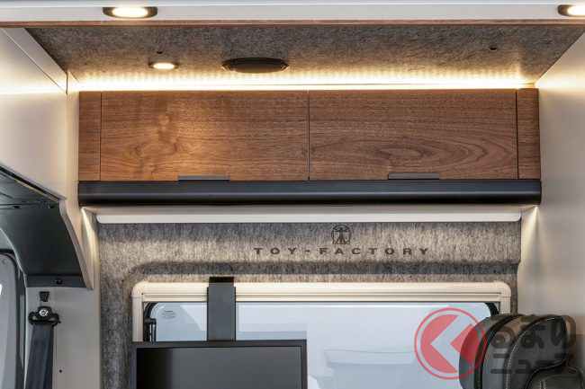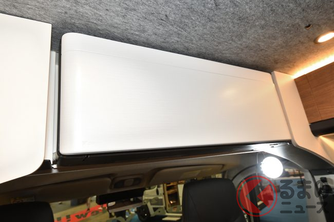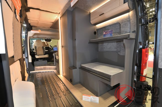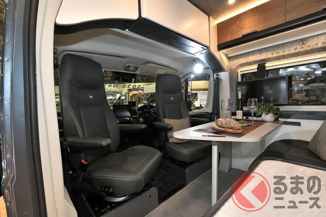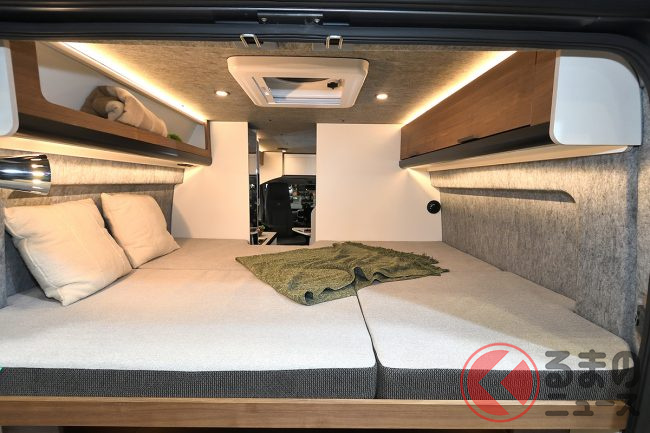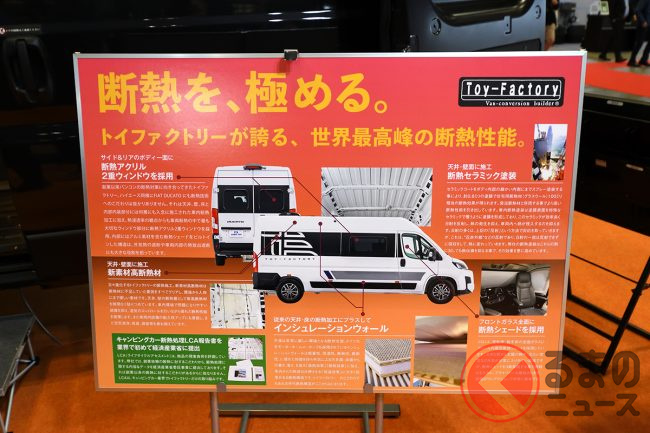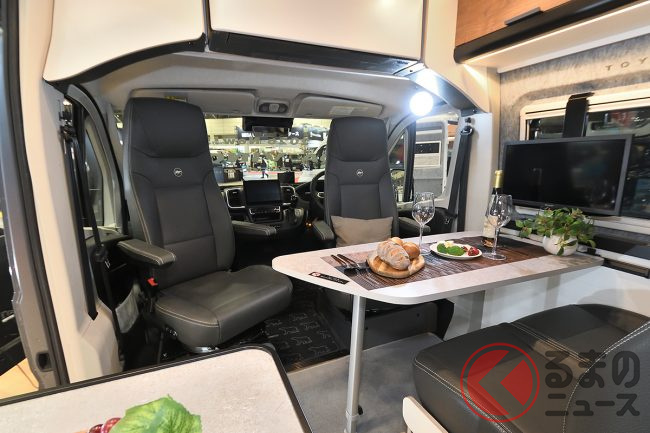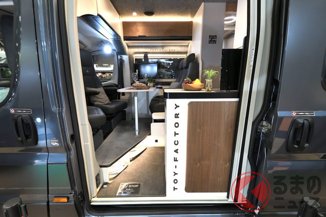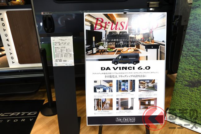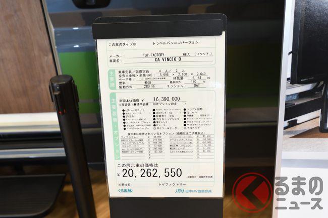 展示車ではさらに、外装デカールや19インチTVシステム、リチウムイオンバッテリー、前述のエアコンなどを備えており、プライスタグに掲げられた総額は消費税込みで約2026万円となっていました。