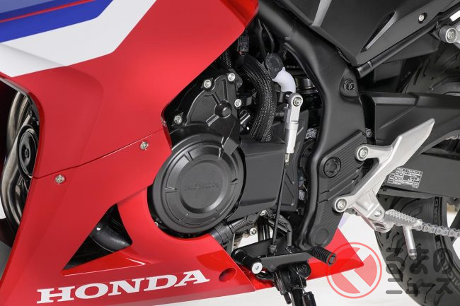 同モデルのベースとなったCBR400Rは、「CBR」の名にふさわしいエキサイティングな走りを提供する排気量399cc水冷DOHC直列2気筒エンジンを搭載するスーパースポーツモデルです。このエンジンは、日常で多用する低・中回転域ではトルクフルで力強く、高回転域ではパワフルかつスムーズに吹け上がる出力特性を備えています。インジェクションシステムの最適化も図られ、スロットル開度に対してリニアに反応する扱いやすさも実現しました。