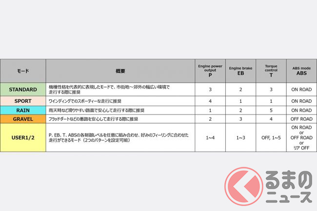 ライダーをサポートする電子制御も充実しており、走行状況に応じて設定を変更できるライディングモードが搭載されています。「SPORT」「STANDARD」「RAIN」「GRAVEL」の4つのプリセットモードに加え、個別にパラメーターを調整できる「USER」モードを含む計5種類から選択可能です。