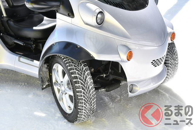 試乗車両は、通常12インチタイヤが装着されるトヨタのコムスをベースに、オーバーフェンダーの装着など改造を施して、軽自動車サイズである155/65R14のシンクロウェザーが装着されています。