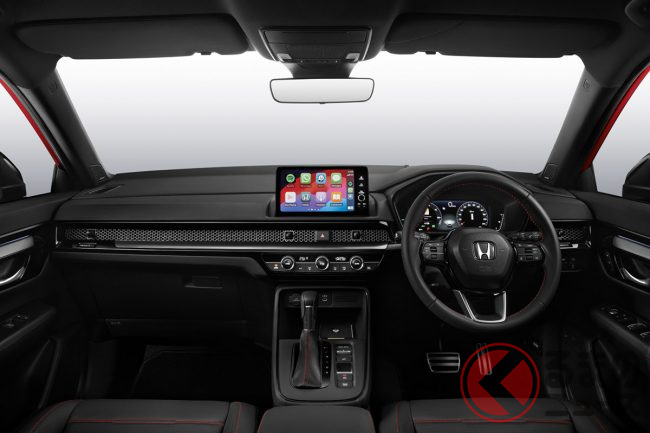インテリアでは、最上位モデルの「e:HEV RS」にダークヘアライン調の加飾フィルムがダッシュボードに施され、よりプレミアムな雰囲気を演出。RSロゴがエンボス加工されたシートが、スポーティかつフラッグシップとしてのキャラクターを強調しています。