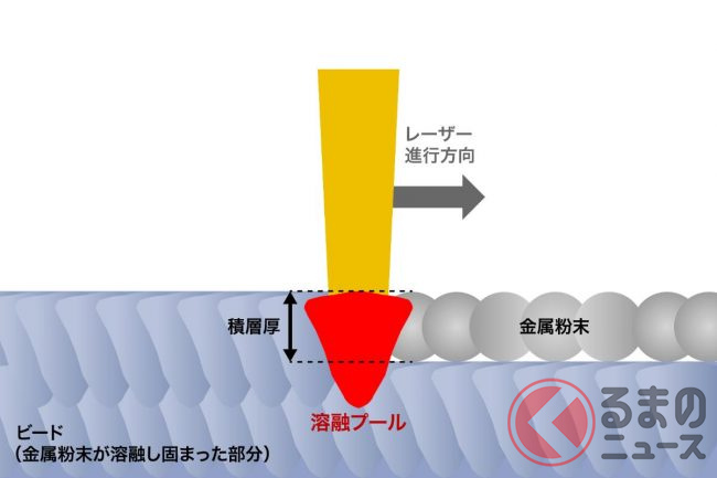 同社でも研究が進む、現在の金属3Dプリンターの主流となっているLPBF(レーザー粉末床溶融結合法)では、0.01mmから0.05mm程度の非常に細かい金属粉末を薄く敷き、レーザーで溶融させながら積層して形状を作り上げます。