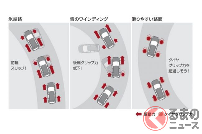 e-4ORCEがもっとも効果を発揮するのは、雪道や凍結路といった低μ路面(注:μ=摩擦係数・滑りやすい路面)です。