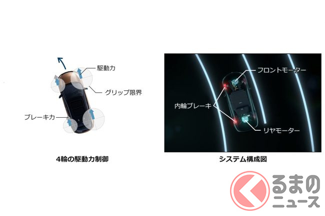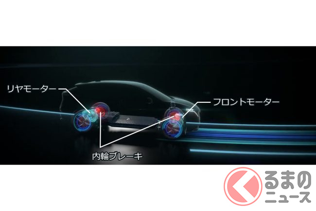 前後モーターは独立して制御され、発進時や加速時、旋回時に駆動力と回生ブレーキを統合的に調整し、車両姿勢が乱れにくいよう常時きめ細かく制御されています。