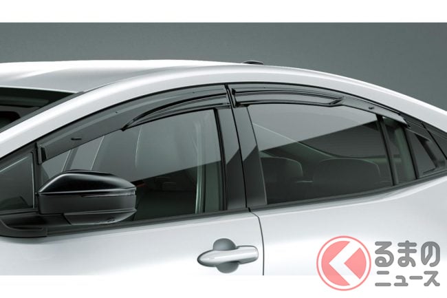 まず、GRスポーツサイドバイザー(2万7500円)は、換気性能の向上に加え、一般的なドアバイザーに対してエアロスタビライジングフィンを備えることで、走行安定性や応答性の向上に貢献します。