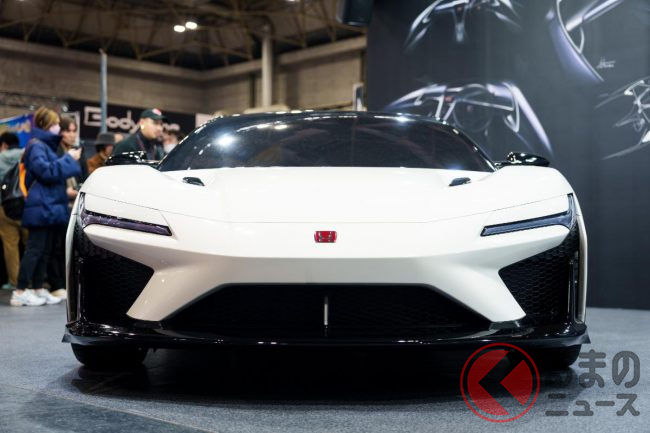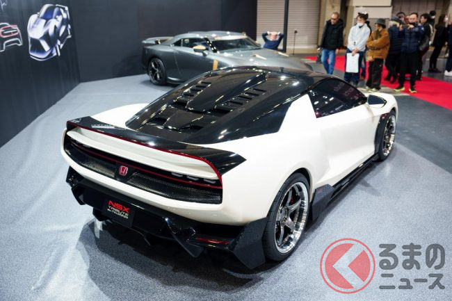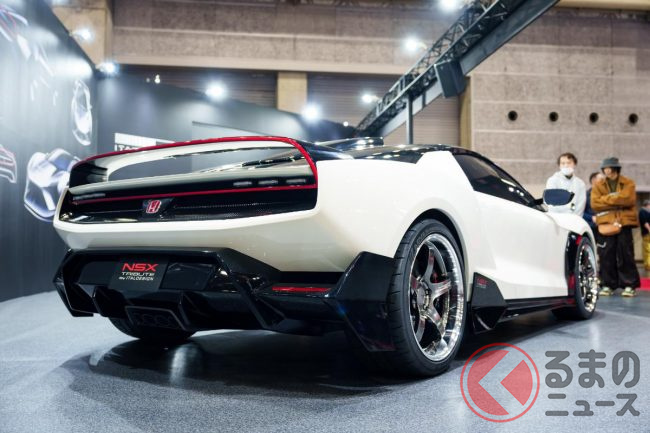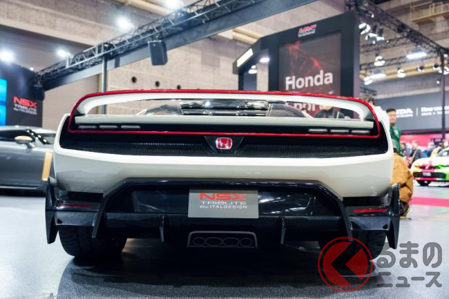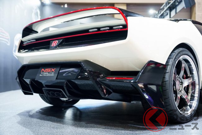 新たな「ホンダ“NSX”」登場! “初代オマージュ”の専用デザイン&「タイプR」の「赤い“H”エンブレム」がカッコイイ! “豪華なフルオーダー内装”も期待のイタルデザイン「ホンダ NSX トリビュート」実車展示!