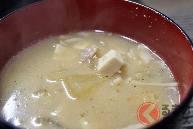 続いて「豚汁」も到着。他のお客さんを含め、卓と厨房を何度も往復するお婆さまの姿を見て、「自分で取りに行った方が良いかも……」とも思ったのですが、「余計なお世話だよ」的なオーラを放っている気もしたので、今回は機を逃してしまいました。