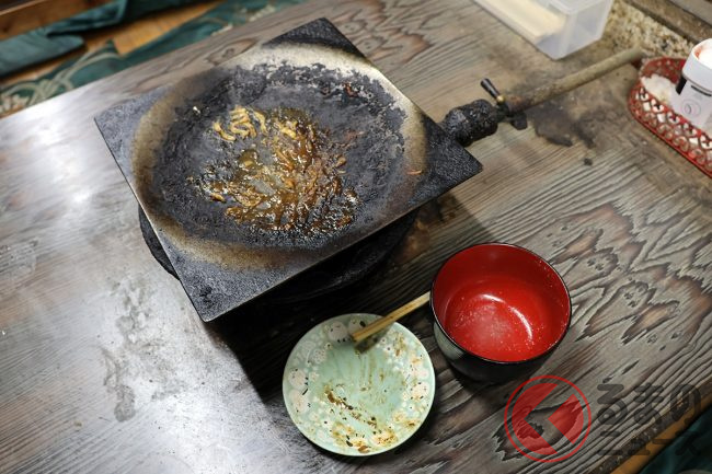 残り1/3ぐらいになったところで、お婆さまがうどんと“合わせ水”を投入してくれました。撮影に夢中になり、火の調整を怠っていた筆者を見かねて、手を差し伸べてくれたようです(感謝)。