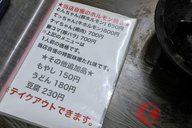 看板メニューは「とんちゃん(650円)」&「てっちゃん(800円)」のホルモン焼きで、「ケイちゃん(鶏肉・700円)」や「豚コマ(豚バラ・700円)」も用意。