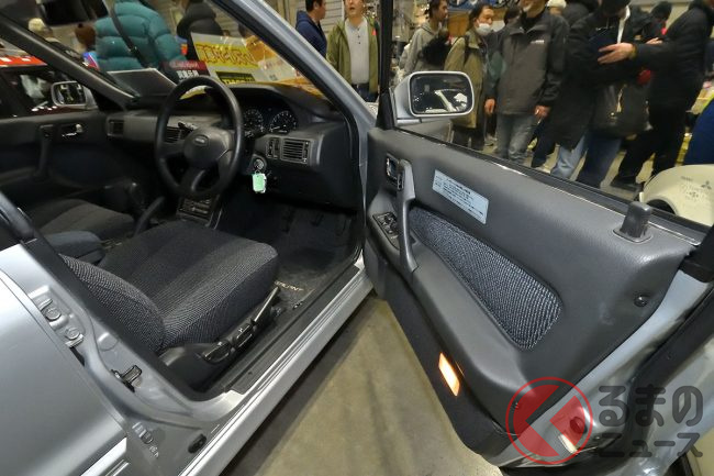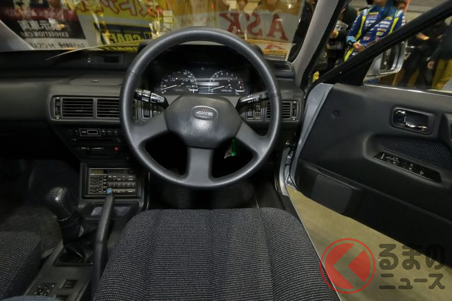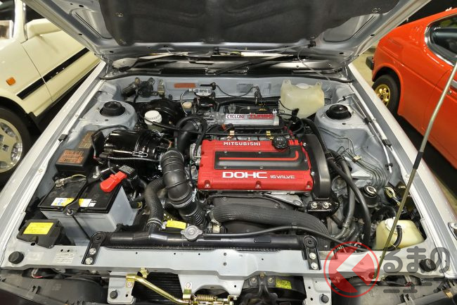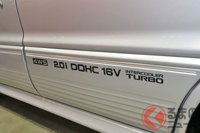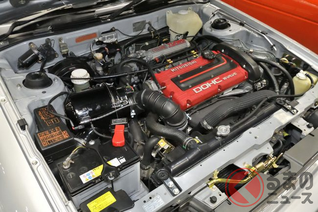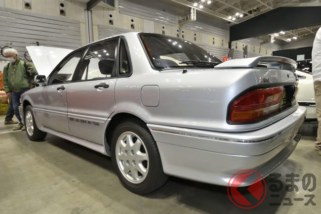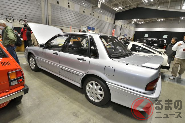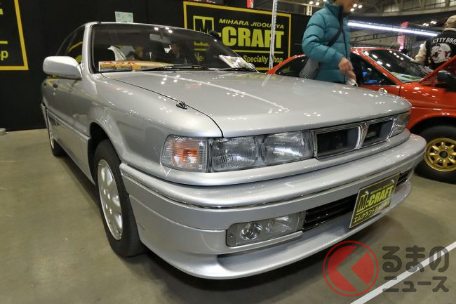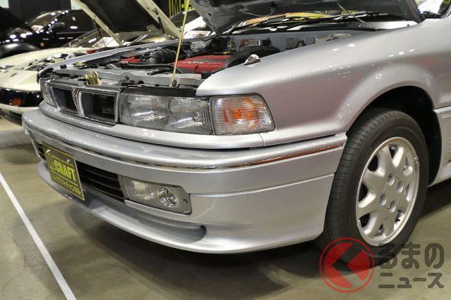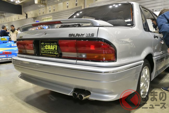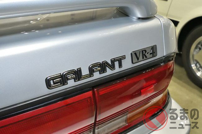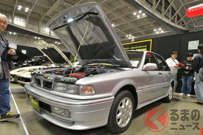 三菱「超・高性能4WDセダン」実車展示! カクカクボディに「高出力2リッターターボ」搭載! オジサン世代歓喜の“名車”「ギャランVR-4」 三原自動車がレストア車両を披露