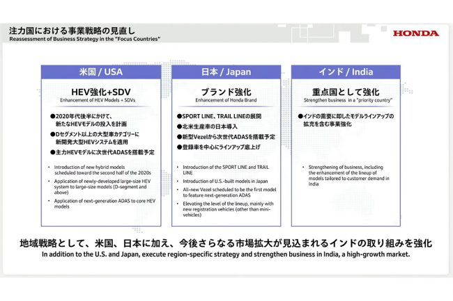 具体的には、鳴り物入りで進めていた次世代EV「Honda 0 SUV/Honda 0 Saloon/Acura RSX」の開発・発売などの中止を決定。それに伴う投資や将来の損失を前倒しで計上し、いわば膿を出すことによって“再起”を図っていきます。