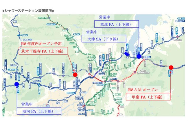 なおNEXCO西日本ではシャワーステーションの設置施設を増やしており、名神・新名神ではすでに大津SA、草津PAに設置。2026年度には茨木千提寺PAの上下線にも設置される予定です。