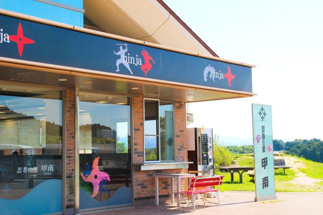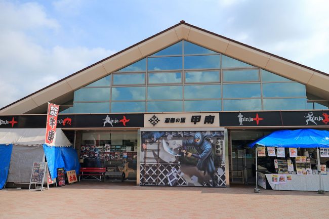 甲賀市は忍者で有名なことから、施設は「忍者の里 甲南」という名称が付され、忍者をモチーフにしたお土産のほか、名産品の信楽焼や近江牛コロッケなども名物となっています。鈴鹿山脈を見渡せる展望台や、ドッグランも併設されています。